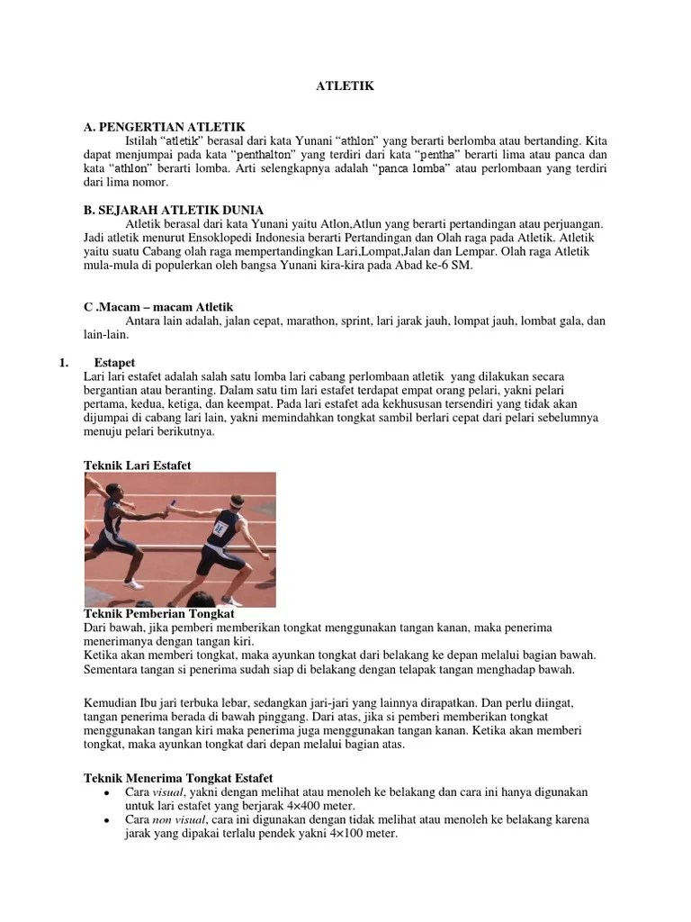 Sejarah atletik jalan dan lari serta manfaatnya. Dalam olahraga ini, atlet mengutamakan kecepatan dan kecakapan dalam . Definisi berjalan (jalan cepat) adalah bergerak maju. Jalan cepat juga sering ditandingkan dalam cabang olahraga atletik. Dilansir oleh britannica, sejarah atletik sudah tercatat dalam ajang olahraga trek.